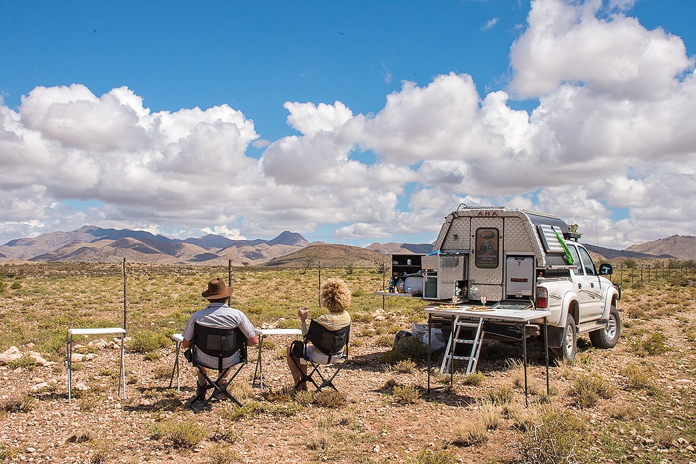 Op die foto sit ek en my vrou, terwyl ons ontbyt eet, sommer langs die pad, en staar na die Karasberge. Dit is nie iets wat mens sommer in ons eie SA kan doen nie.